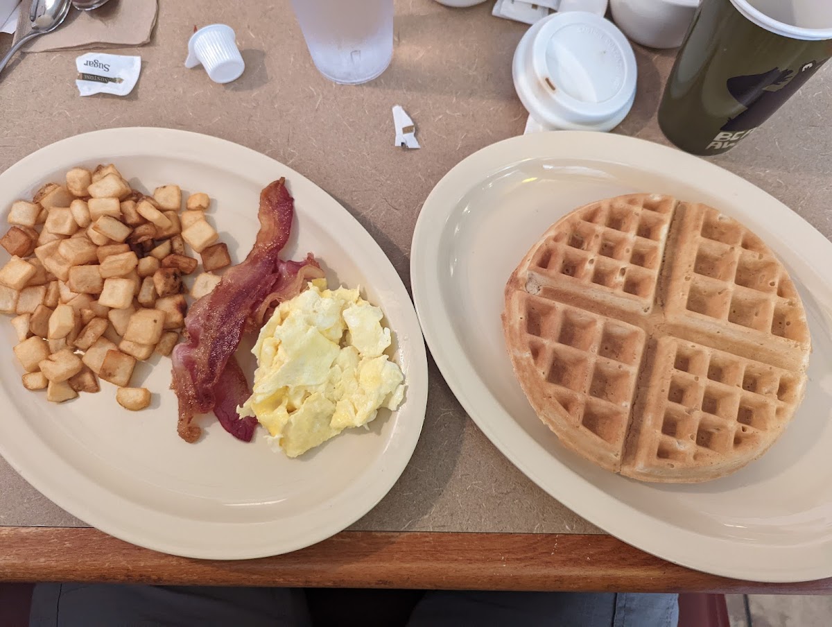 My husband loves to go out to breakfast, and we'd never been to Ma's Diner. He got his usual restaurant breakfast--eggs, sausage, home fries and toast. The sausage was from Bradley's and was especially good. I had never had waffles and fried chicken before, so that's what I ordered. I really enjoyed it. The waffle tasted scratch made (oftentimes restaurant pancakes and waffles taste like they're made from a packaged mix). It was thick, hot and cooked perfectly. They serve real butter and the syrup was good. (They also serve Smucker's jam for toast.) The fried chicken was delicious and a huge serving (leftovers!). We didn't try the coffee, because we'd already drunk several mugs at home. Our waitress did a great job and she and two guys covered the busy restaurant very efficiently.